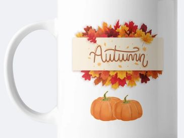 We offer personalized mugs for every season; this is our new Personalized Autumn Mug! The picture features a beautiful autumn banner with leaves and two pumpkins below it, and we can personalize the banner with your name on one side of the mug, while the word "Autumn" stays in the banner on the other side.